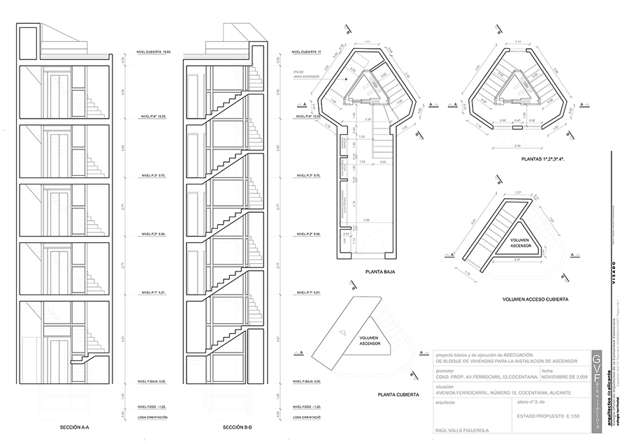 Fecha de redacción del proyecto: Noviembre de 2.009 Tipo de intervención: Instalación de ascensor en el ojo de la escalera existente con recorte de ésta Número de plantas del edificio: 5 (Planta baja + 4 Plantas de piso) Presupuesto de ejecución material de las obras sin incluir el ascensor: 42.154,62 euros |